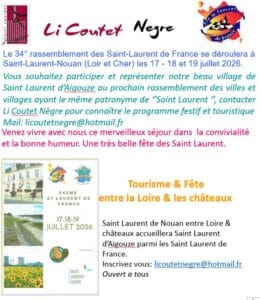 Les 17, 18 et 19 juillet prochains se tiendra le 34ᵉ rassemblement des Saint-Laurent de France, cette année à Saint-Laurent-Nouan, dans le Loir-et-Cher.