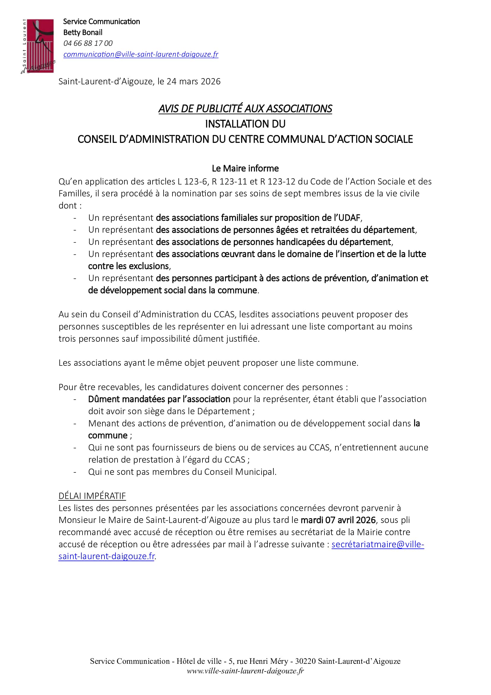 Dans le cadre de l’installation du CCAS, la commune invite les associations à faire acte de candidature selon les conditions détaillées ci-après : Avis de publicité aux associations